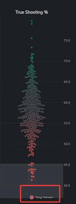 杨瀚森目前的真实命中率位列全联盟倒数第一(尽管样本量较小,但仍不足40%,只有39.5%),甚至大幅落后于联盟真实命中率倒数第二的球员(克里斯-保罗,其数据样本量同样不大,数据是41.3%)。
