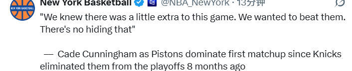 在谈到去年季后赛被淘汰后首次与尼克斯队交手的感受时,坎宁安表示:“是啊,现在是全新的赛季了,所以我们努力把过往那些事情都抛在脑后。但显然,我们都清楚这场比赛有着不一样的分量。击败他们,就是我们的目标,这一点无需掩饰。就像你说的,这是大家心照不宣的事,但我们更想延续一整个赛季以来的节奏,把连胜势头保持下去。”