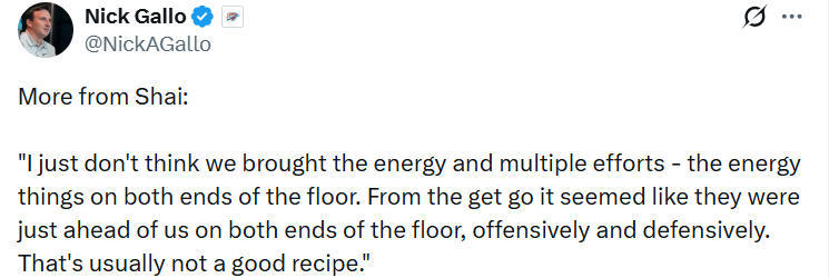 在谈到这场失利时,亚历山大说道:“我完全不觉得我们在攻防两端打出了应有的拼劲和持续性强度。从比赛一开始,他们就在攻防两端都压制着我们,不管是进攻还是防守。这种局面通常都不是什么好兆头。”