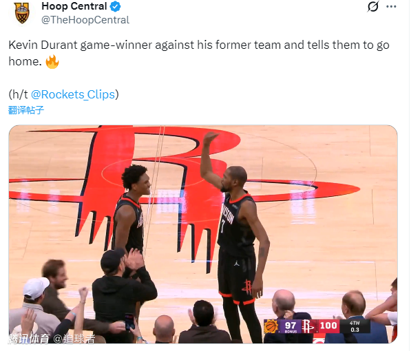 2026-01-06 12:20北京时间1月6日,NBA常规赛火箭主场100-97险胜太阳,申京因脚踝扭伤缺席比赛,杜兰特出战38分钟,21投9中、三分12中2拿到26分10篮板4助攻;生死时刻,杜兰特1.1秒三分绝杀手刃旧主,KD绝杀后歪嘴招手疯狂庆祝,示意让太阳滚回家。