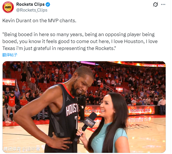 谈到主场MVP的呼声,杜兰特说道:我多年来在这里被嘘声对待,作为对手被嘘,你知道现在能站在这里感觉很好。我爱休斯敦,我爱德克萨斯,我很感激能够代表火箭出战。