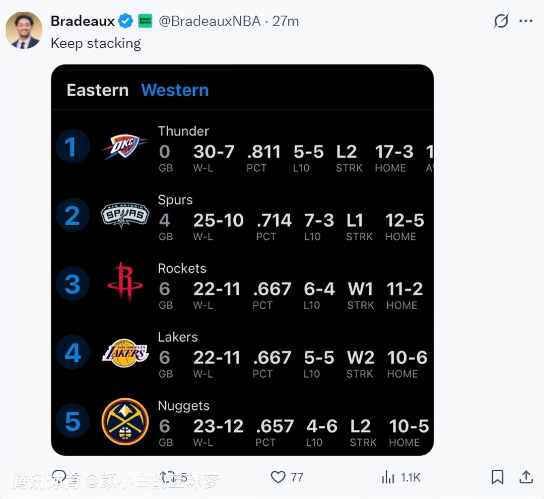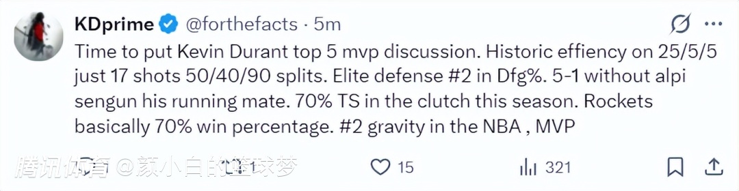 5.是时候将杜兰特纳入MVP讨论了,他的命中率依旧在50/40/90左右,他的限制对手命中率联盟第二出色。防守篮板率也是联盟前列,在没有申京的情况下他带队5胜1负,决胜时刻的出手命中率高达70%,他应该是联盟前二的超巨,也是MVP候选人。