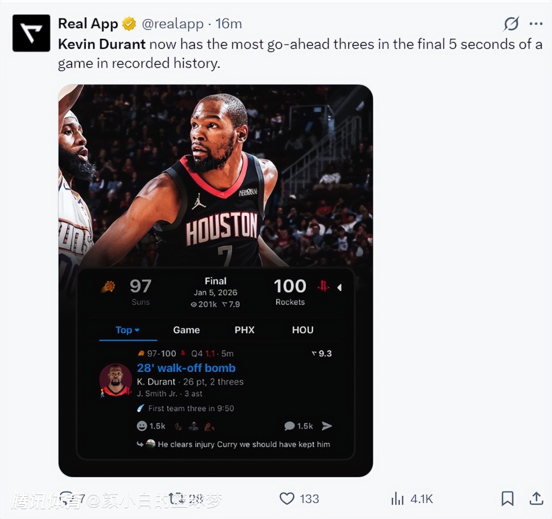 KD准绝杀后休媒为之疯狂!决胜时刻命中70% 他是真领袖 火箭系交易赢家