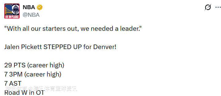 在谈到掘金队多名主力缺阵为何能赢球时,皮克特说道:“我们都觉得上一场打得很糟糕,所以今晚必须拿出十足的拼劲和活力。带着这种放手一搏、全力争胜的心态去比赛,其实任何结果都有可能发生。”