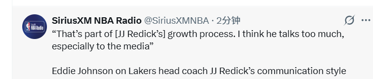 2026-01-06 13:10北京时间1月6日,前NBA球员埃迪-约翰逊谈到了湖人队主教练雷迪克,他表示雷迪克的话太多,有时候可能会引发球员的反感。