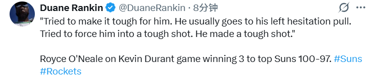 2026-01-06 13:40北京时间1月6日,NBA常规赛继续进行,火箭队100-97险胜太阳队。罗伊斯-奥尼尔此役得到15分6篮板3助攻,赛后他接受媒体采访,谈到了自己对于杜兰特关键一攻的防守。