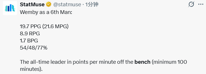 文班亚马替补出战时场均打21.6分钟,可以得到19.7分8.9篮板1.7盖帽,投篮命中率54%,三分球命中率48%,罚球命中率77%。他是NBA历史上替补登场每百分钟得分纪录保持者。