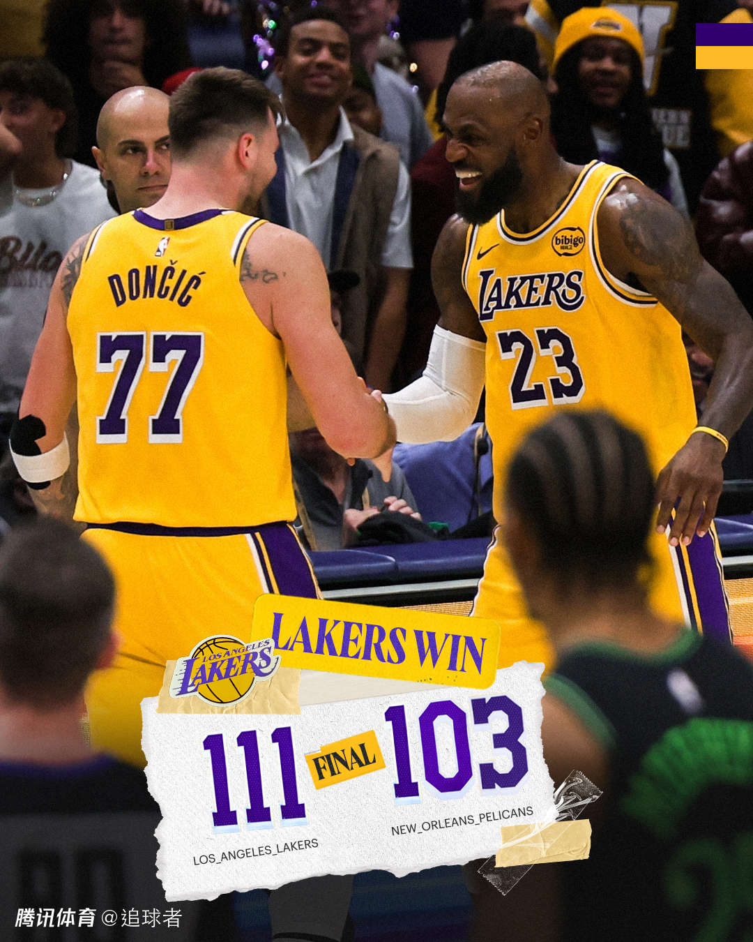2026-01-07 13:20北京时间1月7日,NBA常规赛湖人客场111-103击败鹈鹕,詹姆斯全场19投10中轰下30分8篮板8助攻2抢断1盖帽,东契奇则是22投11中拿到30分10助攻2抢断1盖帽,湖人末节32-17疯狂反扑,关键时刻詹姆斯两次禁区得分,东契奇轰进逆天压哨三分。