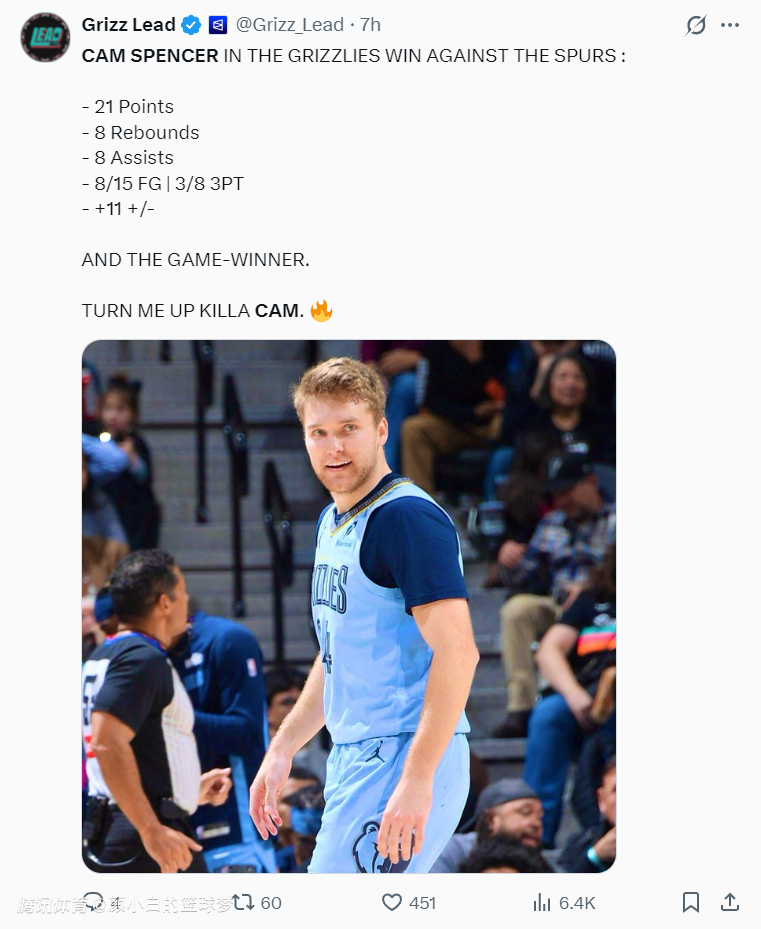 终场前1分26秒斯潘塞三分命中后灰熊还落后马刺1分,随后马刺的福克斯、索汉接连丢了关键球,终场前37秒斯潘塞撤步中投命中帮助灰熊反超。福克斯手握绝杀的机会,但被阿尔达马封盖,最终灰熊爆冷击败西部第二,斯潘塞这49秒5分就是决胜五分。