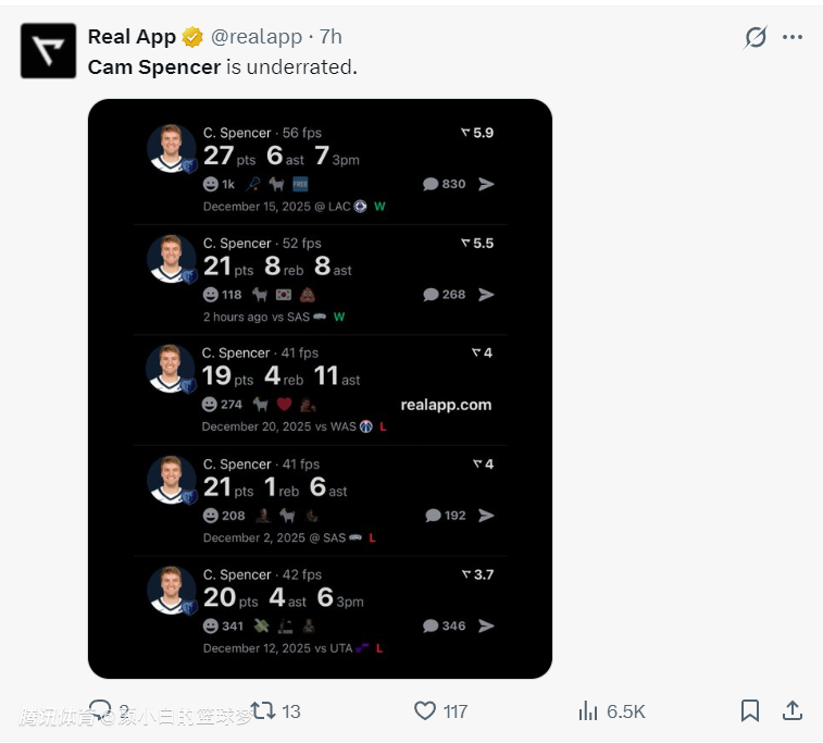 斯潘塞是2024年次轮53顺位被灰熊选中的淘金选手,他24-25赛季是拿双向合同,2025年夏灰熊才跟他签下一份四年1039万的合同,本赛季年薪只有253万,没想到莫兰特本赛季又是各种伤停,这让他有了崭露头角的机会。