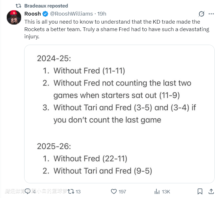 休媒Roosh晒出一张图就可以证明杜兰特的价值有多高:你们需要知道杜兰特的交易让火箭变得多强,如果范弗利特没有遭遇毁灭性的伤病火箭得有多强大啊!