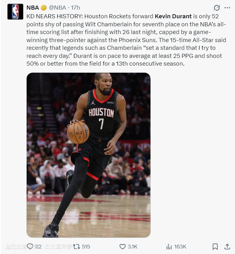 NBA官方还写道:杜兰特拿到26分后他距离历史得分榜第七的张伯伦只差52分,这位15届全明星表示自己设立了一个目标就会努力达到,他有希望在生涯第13个赛季继续场均25分+且命中率超过50%。