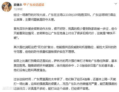 媒体人“赵探长”发文点评:广东德比:广东宏远110-105深圳新世纪,很精彩的比赛。