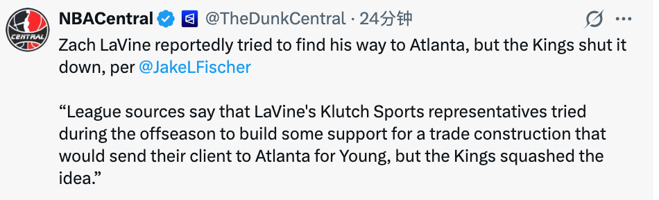 Fischer透露:“联盟消息源透露,拉文所属的Klutch体育经纪团队在休赛期曾试图推动一笔交易,让拉文前往老鹰,交换特雷-杨,但国王队直接否决了这个想法。”