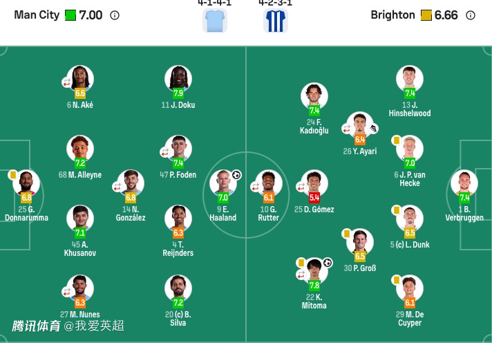曼城首发:25-多纳鲁马、27-努内斯(73'82-刘易斯)、45-胡桑诺夫、68-阿莱恩、6-阿克(64'33-奥赖利)、14-尼科·冈萨雷斯(73'16-罗德里)、20-B席、4-赖因德斯、47-福登(73'10-谢尔基)、11-多库、9-哈兰德