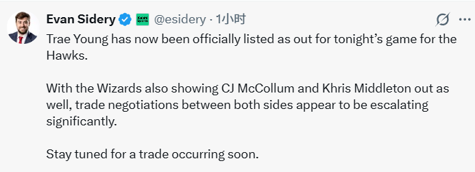 2026-01-08 06:20北京时间1月8日,就在名记Shams报道奇才成为特雷-杨的首选下家后不久,名记Sidery跟进指出,特雷-杨已被老鹰队正式列入今日比赛的缺席名单。与此同时,奇才队也宣布CJ-麦科勒姆与米德尔顿也将缺席今日的比赛。种种迹象表明,两队围绕特雷-杨的交易谈判正显著升级。