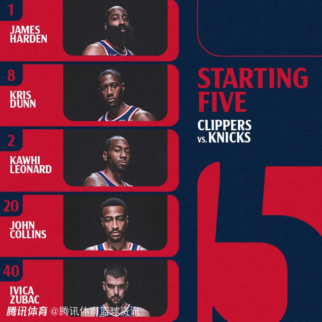 快船首发五人为:哈登、邓恩、莱昂纳德、祖巴茨、科林斯。