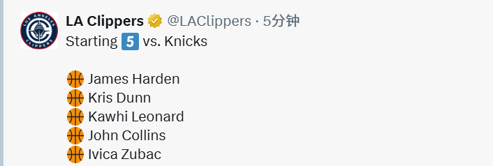 快船今日首发出炉:哈登休战一场后复出 携手小卡祖巴茨对阵尼克斯
