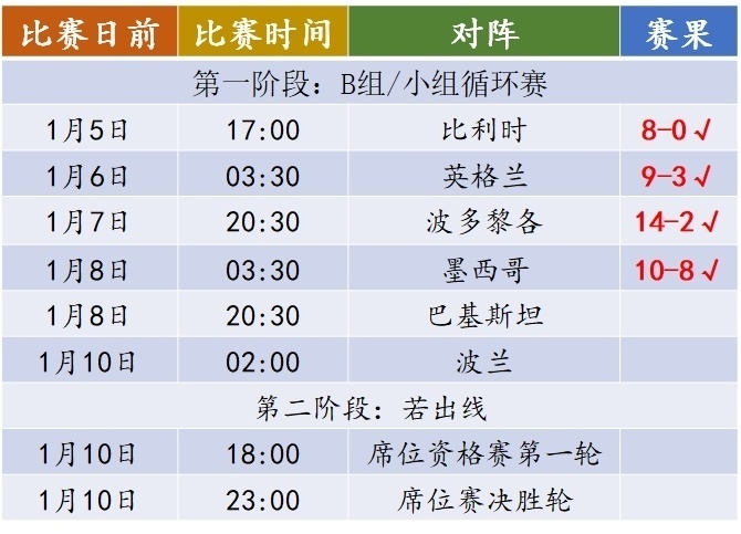 2026-01-08 08:502026冰壶混双世锦资格赛在苏格兰-邓弗里斯继续进行:前三场都轻取对手的中国组合叶紫萱/于森,本轮靠着附加局的强力进攻(PP),最终以10-8艰难战胜墨西哥,迎来了四连胜。