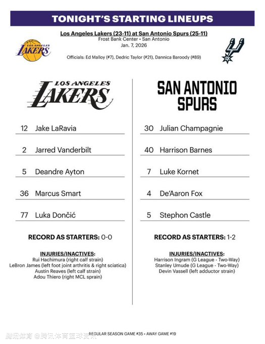 2026-01-08 10:20北京时间1月8日,NBA常规赛继续进行,湖人队对阵马刺队。赛前,双方公布了本场比赛的首发名单。