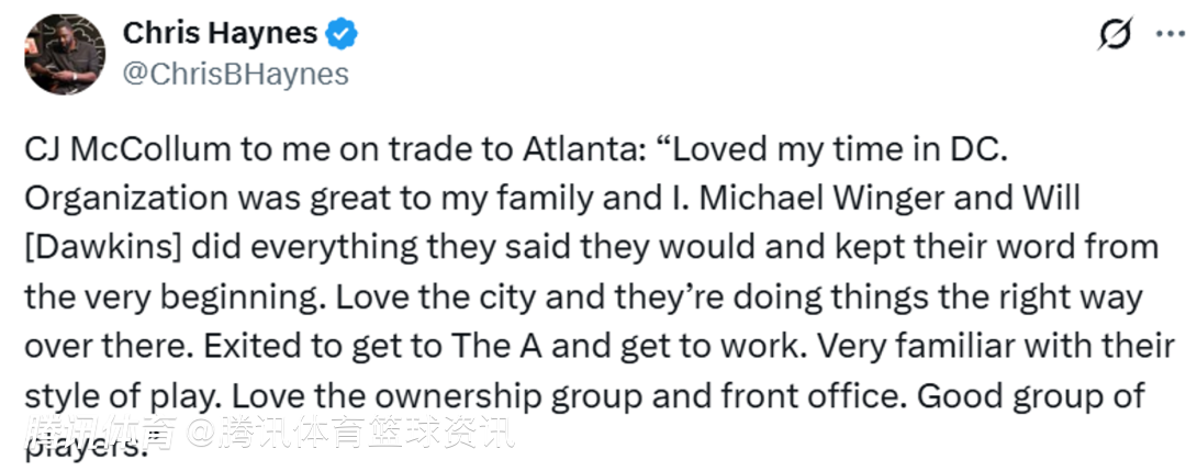 随后CJ-麦科勒姆在谈及被交易至老鹰时向名记Haynes表示:“我很珍惜在华盛顿的时光,球队对我和我的家人都非常好。迈克尔-温格和威尔(道金斯)从一开始就言出必行,兑现了所有承诺。”