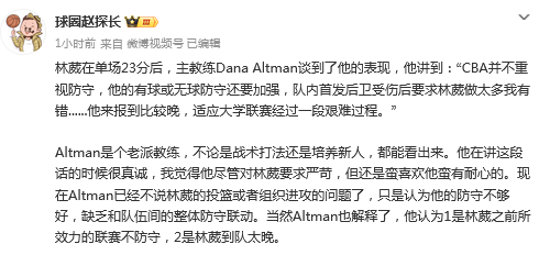 媒体人赵探长发文点评:Altman是个老派教练,不论是战术打法还是培养新人,都能看出来。他在讲这段话的时候很真诚,我觉得他尽管对林葳要求严苛,但还是蛮喜欢他蛮有耐心的。现在Altman已经不说林葳的投篮或者组织进攻的问题了,只是认为他的防守不够好,缺乏和队伍间的整体防守联动。当然Altman也解释了,他认为1是林葳之前所效力的联赛不防守,2是林葳到队太晚。