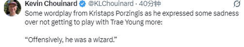 波尔津吉斯很遗憾无法与特雷-杨继续当队友,他说道:“在进攻端,他简直是个奇才。我们搭档的那短短几段时间里,能看得出来他是联盟最顶尖的传球手之一,而且我觉得每个和他同队的球员都能从中受益。他真的太出色了,真的太出色了,没能和他合作更长时间,我心里挺不是滋味。”
