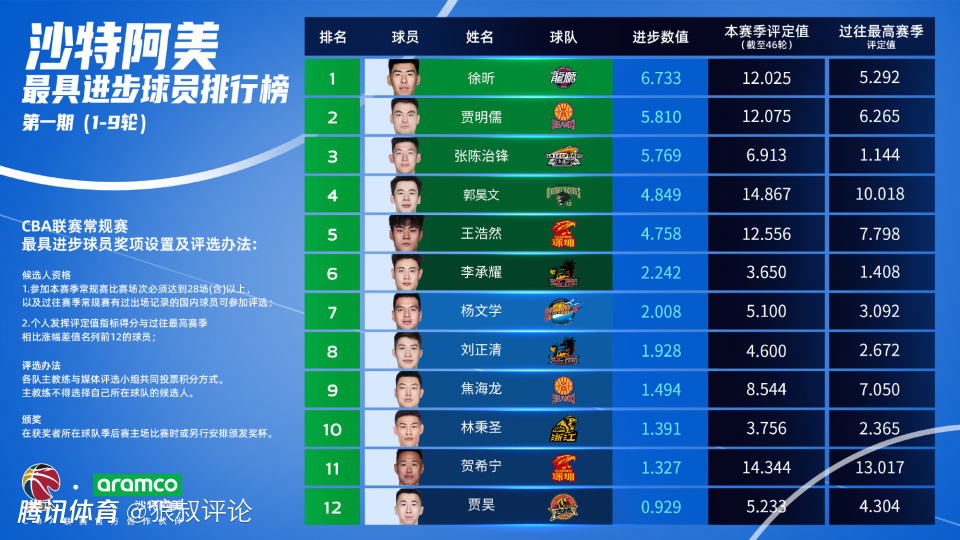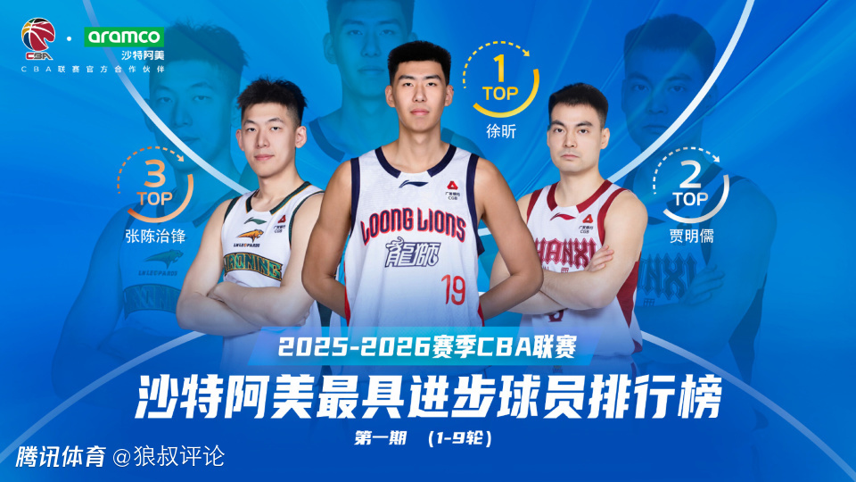2026-01-08 13:30北京时间1月8日,根据CBA官方的公示,2025-2026赛季CBA联赛第1-9轮最具进步球员,广州龙狮球员徐昕排在第一。