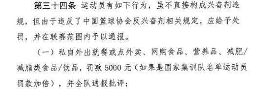 运动员的某些行为,虽不直接构成兴奋剂违规,但由于违反了中国篮球协会反兴奋剂相关规定,应给予处罚,并在联赛范围内予以通报。其中就包括私自外出就餐或点外卖、网购食品、营养品、减肥/减脂类食品/饮品,罚款5000元(如果是国家集训队名单运动员罚款加倍),并全队通报批评。
