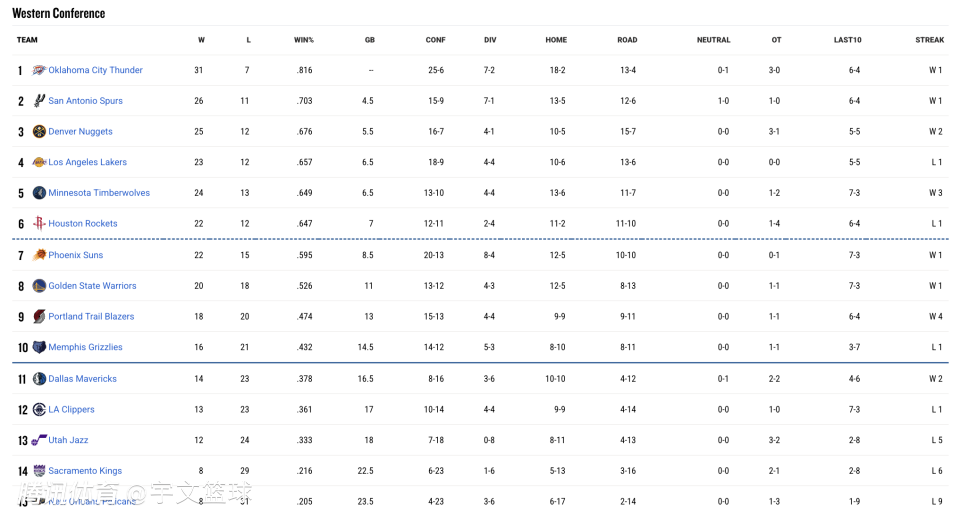 2026-01-08 14:40北京时间1月8日,NBA25-26赛季迎来12场常规赛对决,今日比赛过后,西部的竞争关系变得更加微妙,并且出现了微弱变动,以下是西部15支队伍的最新排名————