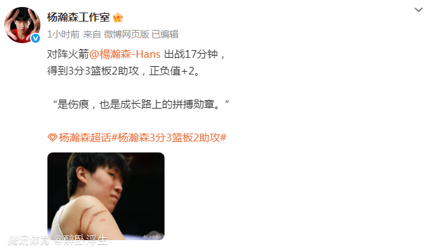 2026-01-08 15:40北京时间1月8日,开拓者103-102险胜火箭收获4连胜,杨瀚森此役替补登场16分31秒,杨瀚森仅有4中1,其中三分3中1,得到3分3篮板2助攻2失误5犯规正负值+2。杨瀚森后三节3中0得到0分,但杨瀚森连续7场比赛登场创生涯最长纪录,也是证明杨瀚森正渐渐进入球队轮换阵容,比赛中拼到身背5次犯规,且胳膊被对手抓出两道血痕引发争议,也是证明杨瀚森足够拼搏。杨瀚森工作室赛后发文回应杨瀚森手臂被抓出血痕:“是伤痕,也是成长路上的拼搏勋章。”