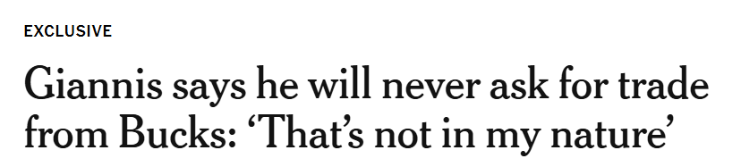 字母哥:你也听到了,球队已经在媒体上表态,‘如果字母哥不主动要求交易,我们就不会交易他’。这还不够说明问题吗?我从来没有去找球队要求交易。
