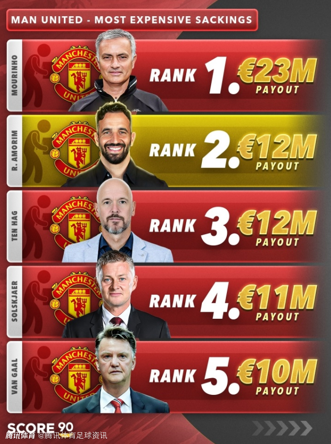 曼联解雇主帅花费榜:穆帅2300万第一 阿莫林1200万欧第2