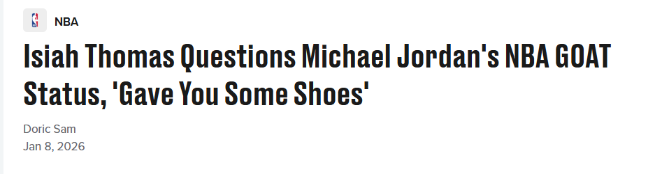 2026-01-09 06:00北京时间1月9日,篮球名人堂成员“微笑刺客”伊塞亚-托马斯再度点燃与传奇球星迈克尔-乔丹之间的恩怨。在做客《追根溯源》节目时,托马斯被问及对NBA黄金时代争议的看法,他借此机会直言,勒布朗-詹姆斯才是超越乔丹的历史最佳球员(GOAT)。