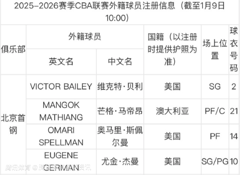 2026-01-09 10:40北京时间1月9日,CBA官网更新了外援注册信息,北京男篮完成维克特-贝利的注册,球队目前共有四名外援,分别是贝利、马帝昂、斯佩尔曼、杰曼。此前据媒体人球圈赵探长报道,贝利并非北京男篮签约的唯一外援,球队还在接洽前NBA球员麦基。