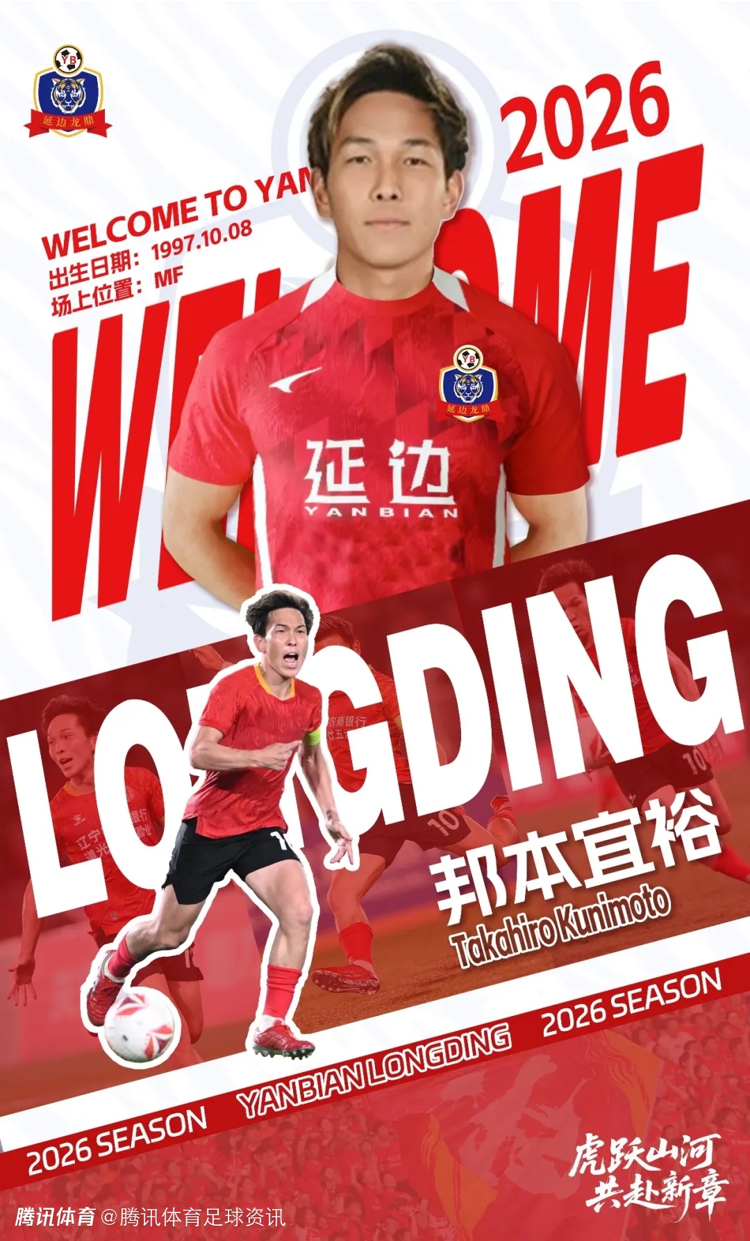 欢迎邦本宜裕加盟延边龙鼎足球俱乐部,相信他的加入将为球队整体实力带来显著提升,并为球队注入冠军基因。美丽延边欢迎你!