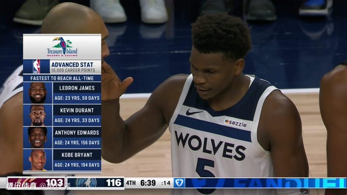3、爱德华兹(24岁157天)超越科比(24岁零194天)成为NBA史上第三年轻的万分先生,仅次于詹姆斯(23岁59天)和杜兰特(24岁33天)。