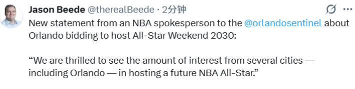 一位NBA发言人向《奥兰多哨兵报》发表声明称:“看到包括奥兰多在内的多座城市,都对承办未来的NBA全明星赛抱有浓厚兴趣,我们感到十分欣喜。期待与各支球队及其本地合作方携手,敲定这项全球篮球盛宴未来的举办地。”
