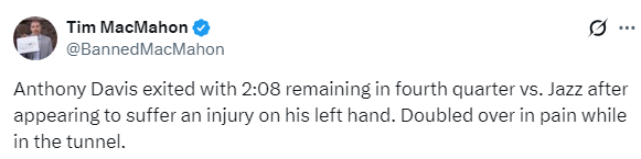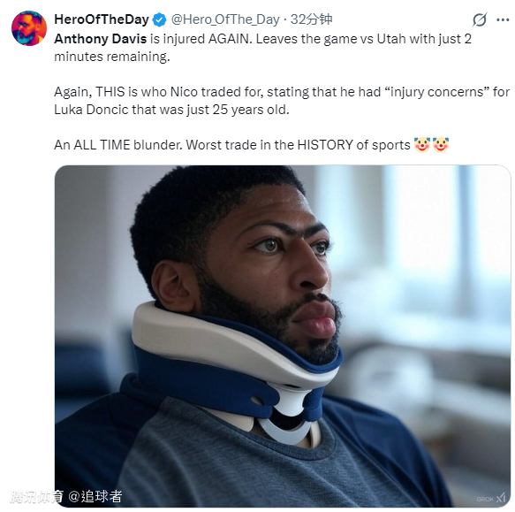 美球迷炮轰独行侠前总经理尼科-哈里森,他写道:安东尼-戴维斯再次受伤。在对阵犹他爵士的比赛还剩2分钟时离场。 再说一遍,这就是尼科交易来的球员,他声称自己对年仅25岁的卢卡-东契奇存在“伤病顾虑”; 史上最愚蠢的错误,体育史上最糟糕的交易。