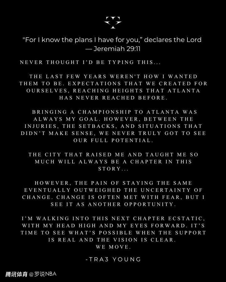 特雷-杨写道:“为亚特兰大带来总冠军一直是我的目标。然而,伤病、挫折以及种种不合理的情况交织在一起,我们始终未能真正发挥出全部潜力。这座培养我、教会我很多东西的城市,永远会是我人生故事中的重要一章。”