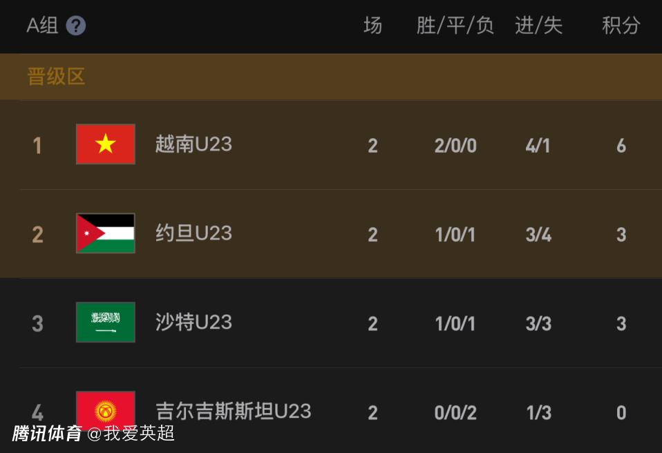 沙特和约旦各积3分,2连败的吉尔吉斯斯坦0分垫底。