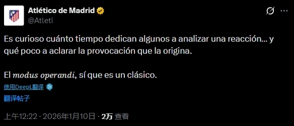 针对这一风波,马德里竞技官方社交媒体随后发布耐人寻味的表态,疑似作出回应。