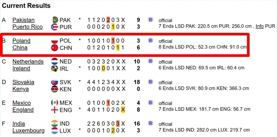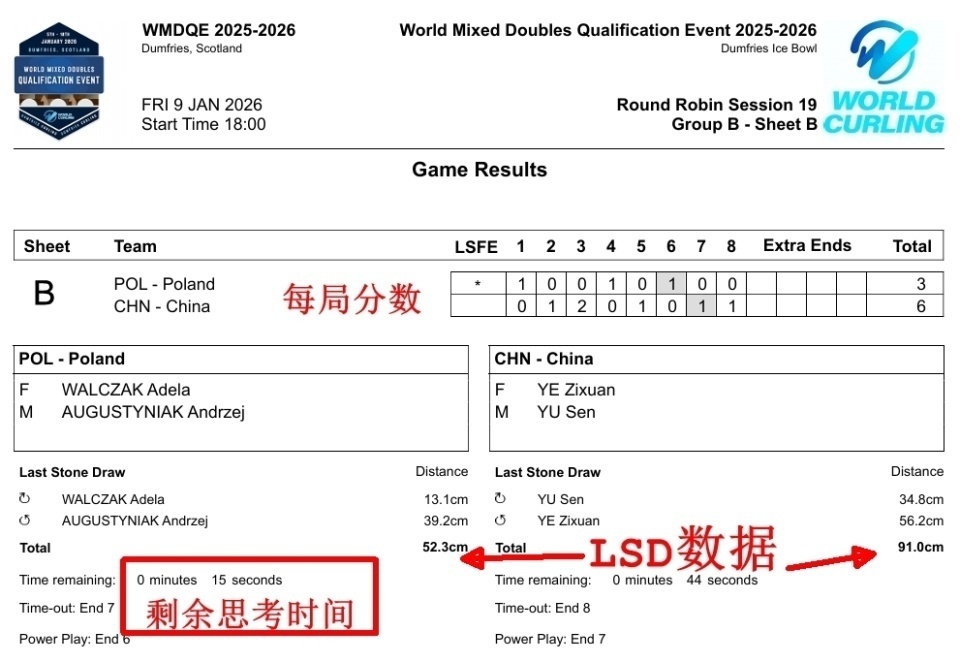 开局前的LSD投掷里,中国队投出了91.0(于34.8/叶56.2);波兰队则是52.3(瓦尔扎克13.1/奥古斯特尼亚克39.2),因此波兰队第一局选择了后手。