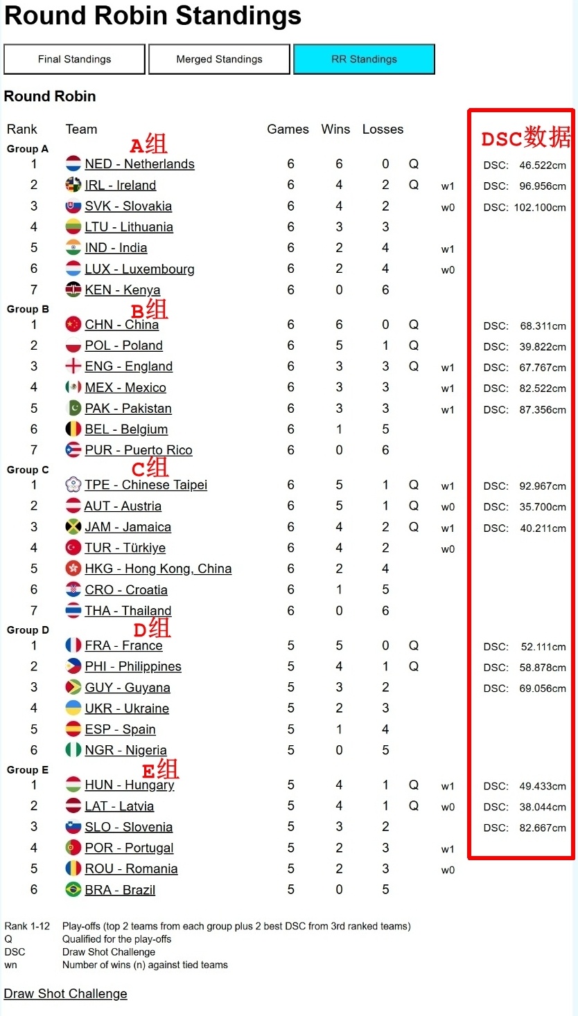 以上10支队伍以小组前二顺利出线,而对比五个小组第三名队伍的DSC成绩,C组牙买加11/40.211和B组英格兰12/67.767拿到了最后2个季后赛席位。