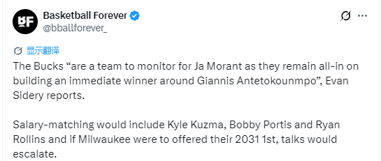 Sidery表示,雄鹿是莫兰特的潜在下家之一,球队仍决心围绕字母哥打造即战力争冠阵容。双方薪资匹配的方案或将包含库兹马、波蒂斯以及罗林斯。若雄鹿方面向灰熊送出2031年的首轮签,这笔交易的谈判进度将会大幅推进。