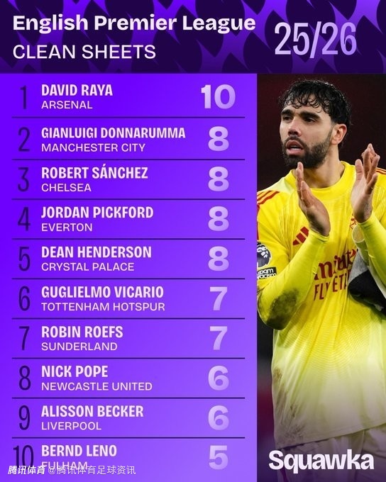 2026-01-10 07:30北京时间1月10日,数据机构 Squawka 统计了本赛季英超联赛门将的零封场次情况,其中阿森纳门将拉亚以10场零封位列榜首。
