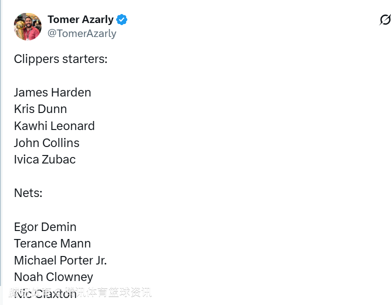 2026-01-10 08:20北京时间1月10日,NBA常规赛继续进行,快船对阵篮网。赛前,两支球队分别公布本场比赛首发阵容名单。快船方面,莱昂纳德联手哈登首发出战,篮网方面,小波特领衔登场。