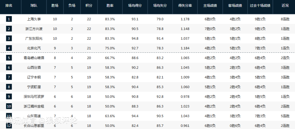 第一档球队当中,除了北京主场不敌山东,输掉了三场比赛外。剩下三支球队都是10胜2负。