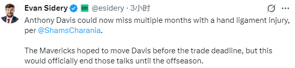 美记者Evan Sidery表示,独行侠原本希望在交易截止日期前送走浓眉,但这次受伤将正式结束这些交易谈判,直到休赛期才会重启交易。