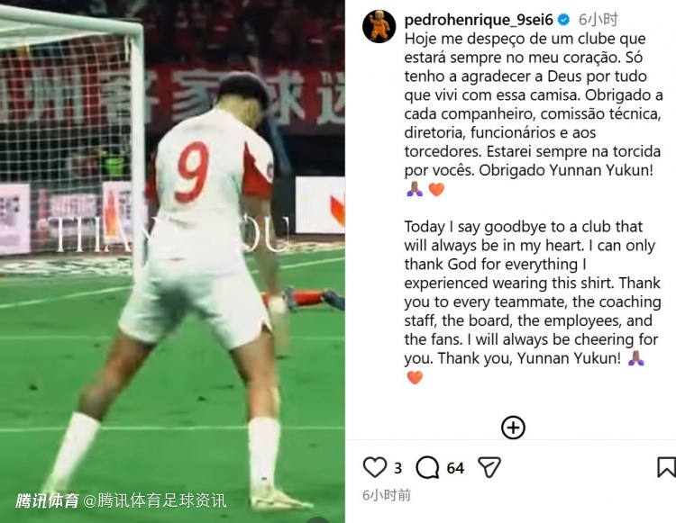 2026-01-10 11:30北京时间1月10日,巴西前锋佩德罗·恩里克更新社媒,向云南玉昆俱乐部告别。
